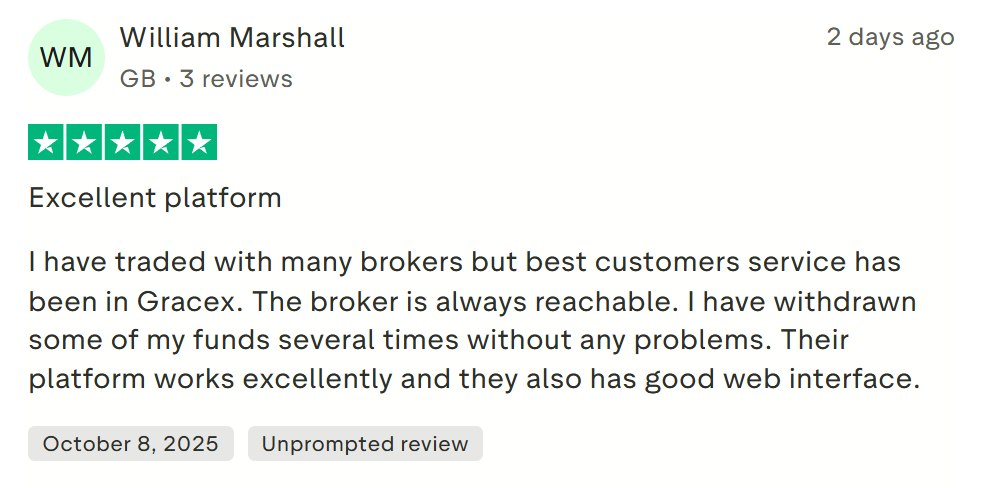 Работаю через Gracex уже пару месяцев. Вцелом нормальный сервис, всё работает как обещано. Быстро поставили мне доступ к инструментам, и торговля идёт без зависаний. Пару раз обращался в поддержку — отвечали быстро. Пока всё устраивает.