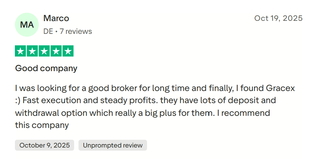 После первых взаимодействий большинство пользователей обращают внимание на техническую сторону. В многочисленных отзывах о Gracex подчёркивается, что MetaTrader 5 работает ровно, без зависаний, а сделки исполняются почти моментально. Важно и то, что пользователи упоминают различные условия рынка — в том числе периоды повышенной волатильности — и даже тогда исполнение остаётся стабильным.